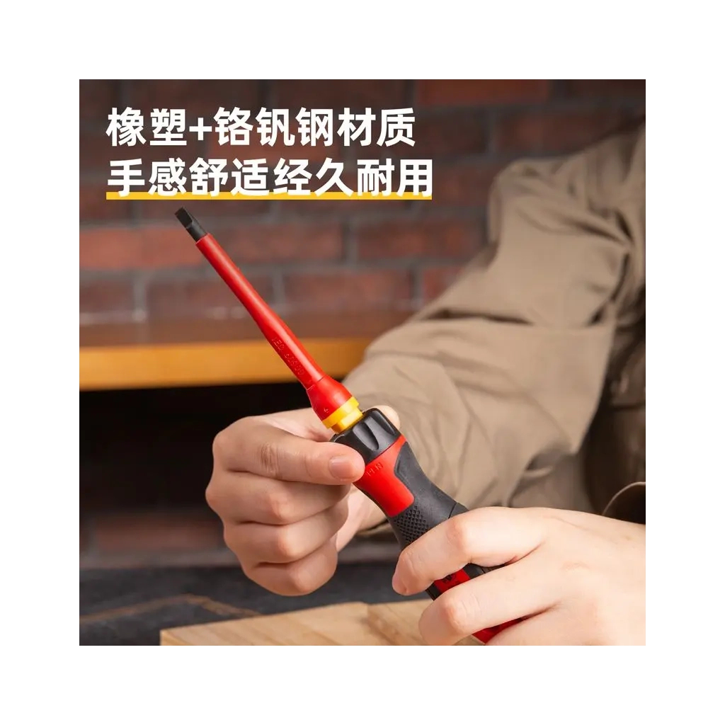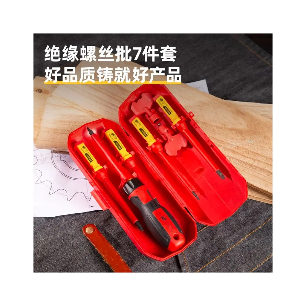 Изолированный набор для безопасной электромонтажной работы — до 1000 В. В комплекте: шлицевые и Philips изолированные отвёртки, резиновая ручка и ключи для треугольных и квадратных электрических коробок. Изготовлен из хромованадиевой стали, упакован в картонную коробку — компактно, безопасно, готово к работе.