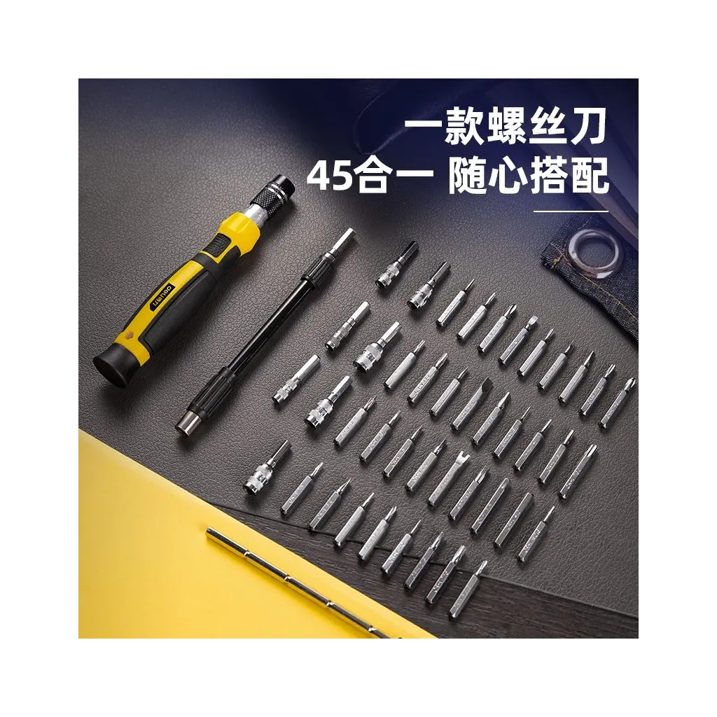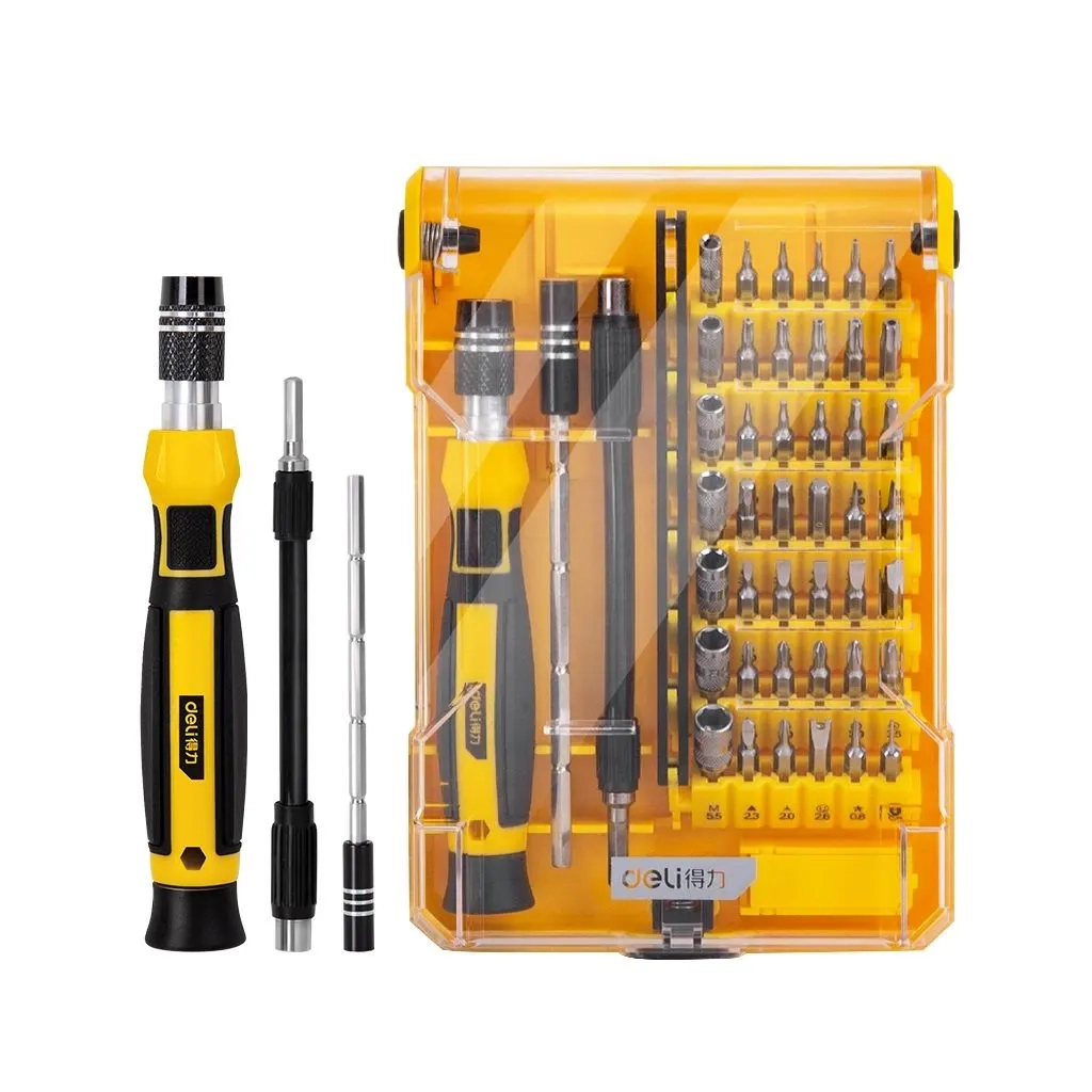 Набор инструментов Deli 45 шт. (DL1045D) — это незаменимый универсальный помощник для вашего дома, в котором сочетаются качество, удобство и функциональность. Этот набор разработан специально для выполнения широкого спектра задач, от простых домашних ремонтов до точных электронных работ. Благодаря тщательно подобранным компонентам, набор охватывает все ваши потребности в обслуживании и ремонте.Особенностью данного набора являются его 45 прецизионных насадок, которые включают в себя плоские, Philips, Torx, шестигранные, треугольные, звездообразные насадки, а также насадки типа U и Y. Это делает его идеальным выбором для работы с точными приборами, такими как iPhone, iPad и другая электроника. Набор включает в себя 1 прецизионную отвертку с поворотной рукояткой, что гарантирует легкость в работе и доступ к труднодоступным местам.