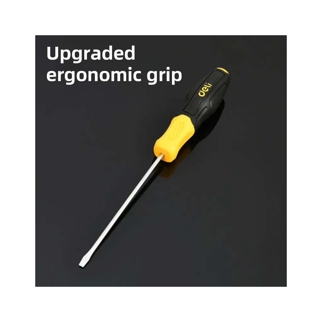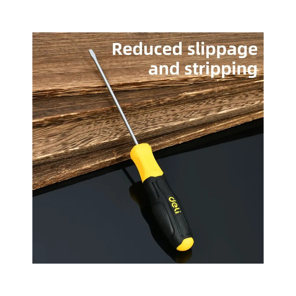 Шлицевая отвертка с длинным магнитным лезвием из стали CR-V — для надёжной работы и труднодоступных мест. Эргономичная двухцветная рукоятка обеспечивает комфорт и контроль. В комплекте пластиковый подвес — удобно для хранения.