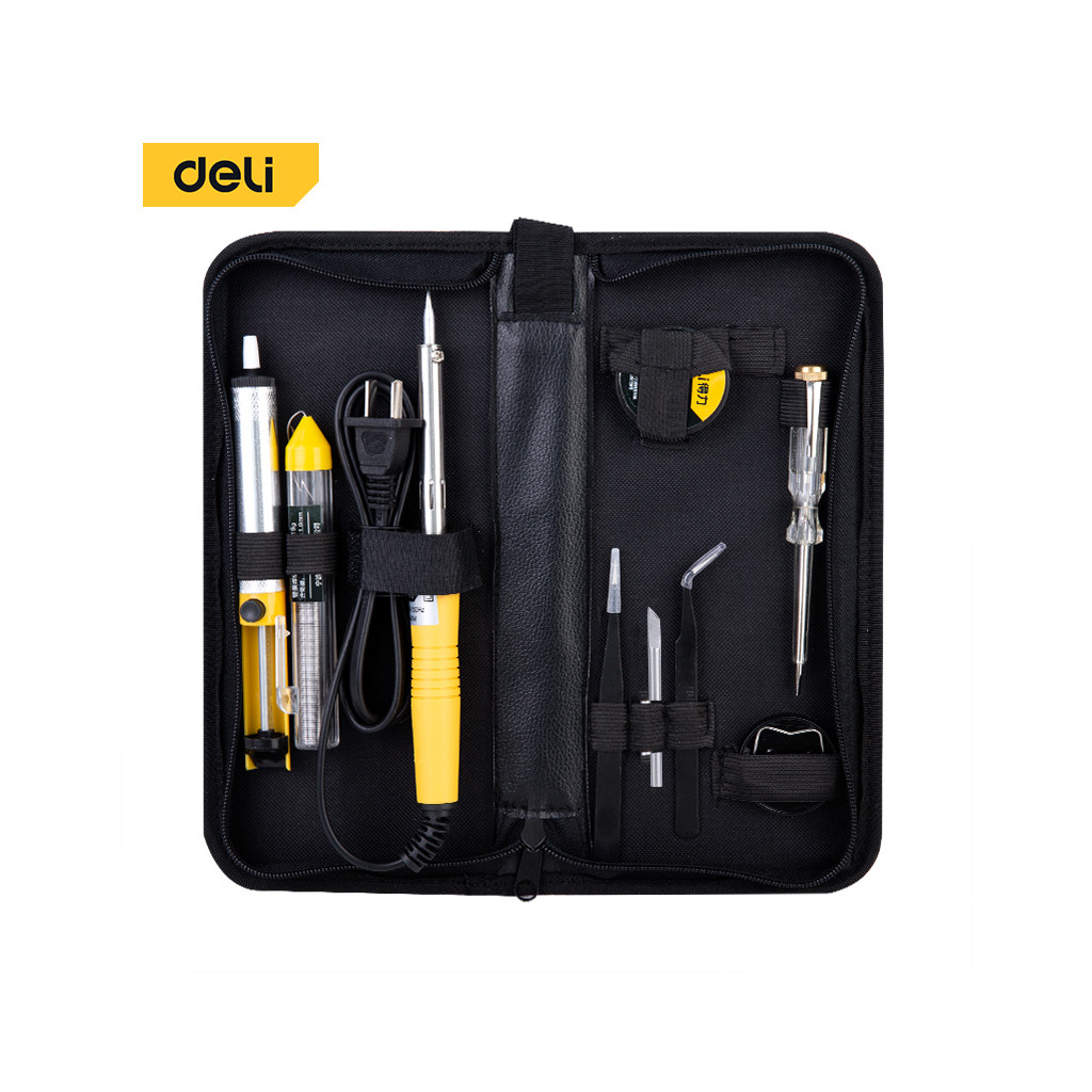 Набор паяльников DeliTols DL393009 из 9 предметов предназначен для эффективных и точных работ по пайке. Паяльник мощностью 40 Вт оснащён двуслойным слюдяным нагревательным сердечником, который обеспечивает быстрое нагревание и стабильную температуру, а также надёжность для детализированных электронных работ. Аксессуары, такие как поглотитель припоя, оловянная проволока, пинцеты, тестер напряжения и жало ножевого типа, повышают его универсальность. Упакован продуманно, набор включает всё необходимое для профессионального и самостоятельного использования.