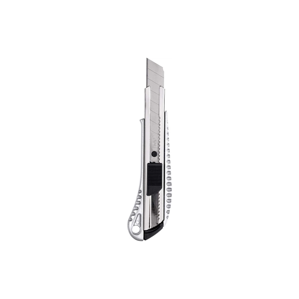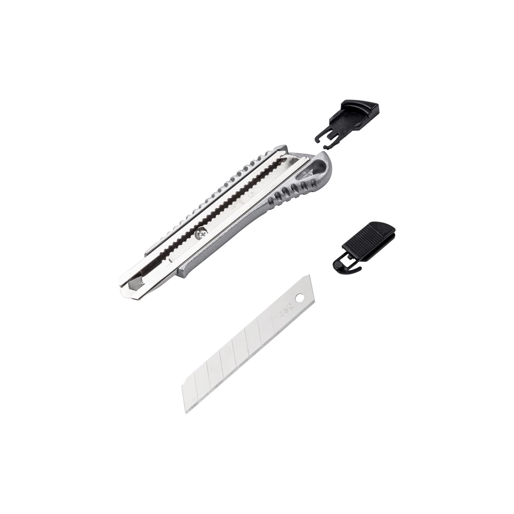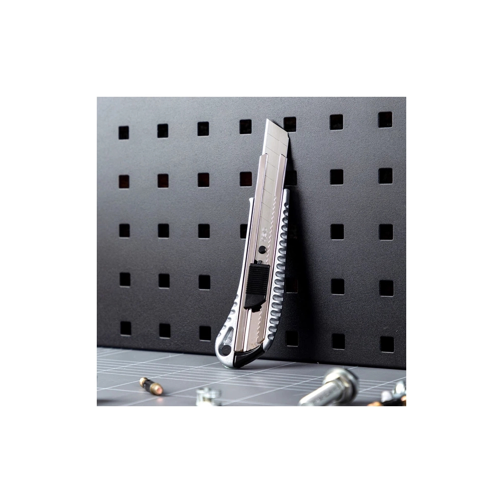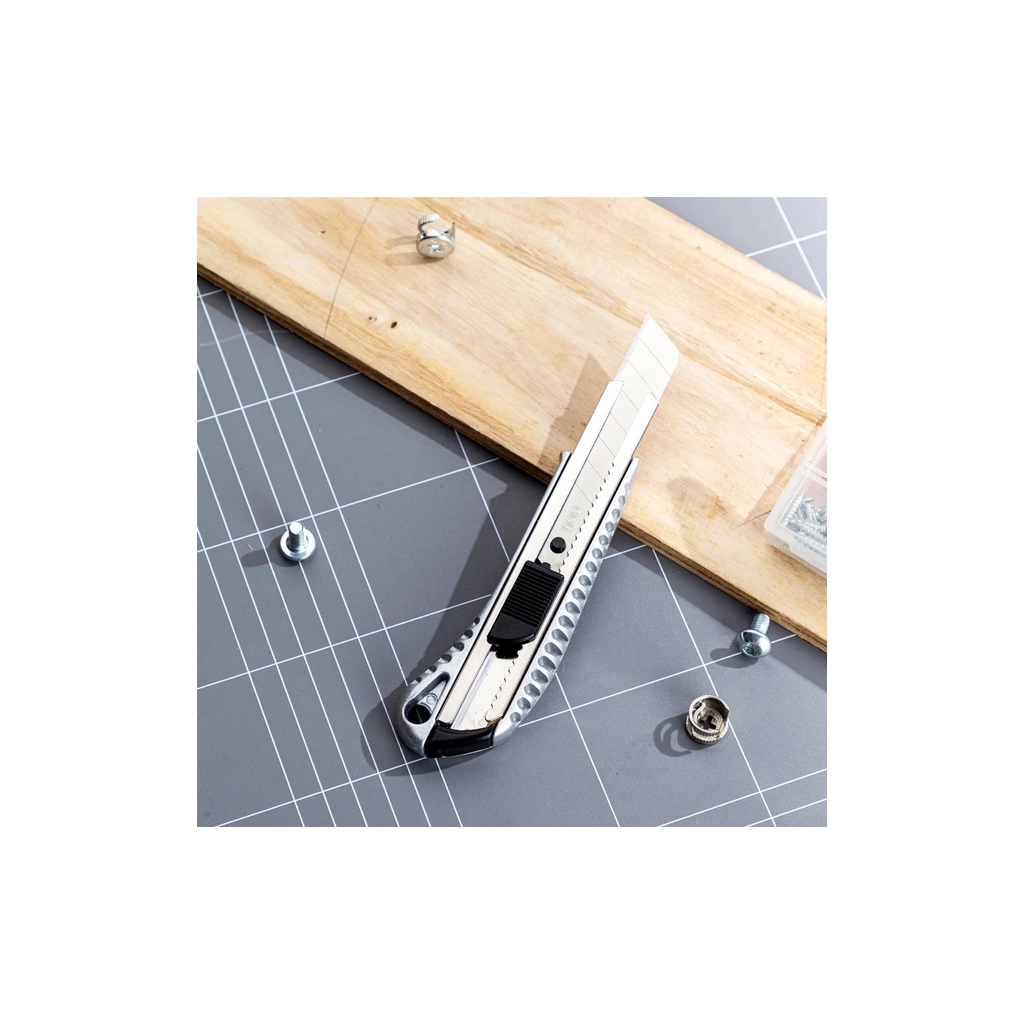 Нож с выдвижным сегментным лезвием 18 мм из инструментальной стали SK2 и корпусом из высококачественного алюминиевого сплава — прочный и точный для ежедневной резки.