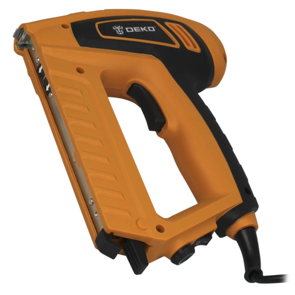 Электрический степлер DEKO отличается совместимостью и портативностью. Этот степлерный пистолет с упором на эргономику гарантирует комфорт. Изготовлен из прочных материалов, отличается хорошим качеством и прочностью. Оборудован ручкой регулировки мощности, пользователи могут регулировать мощность в соответствии с различными потребностями работы.