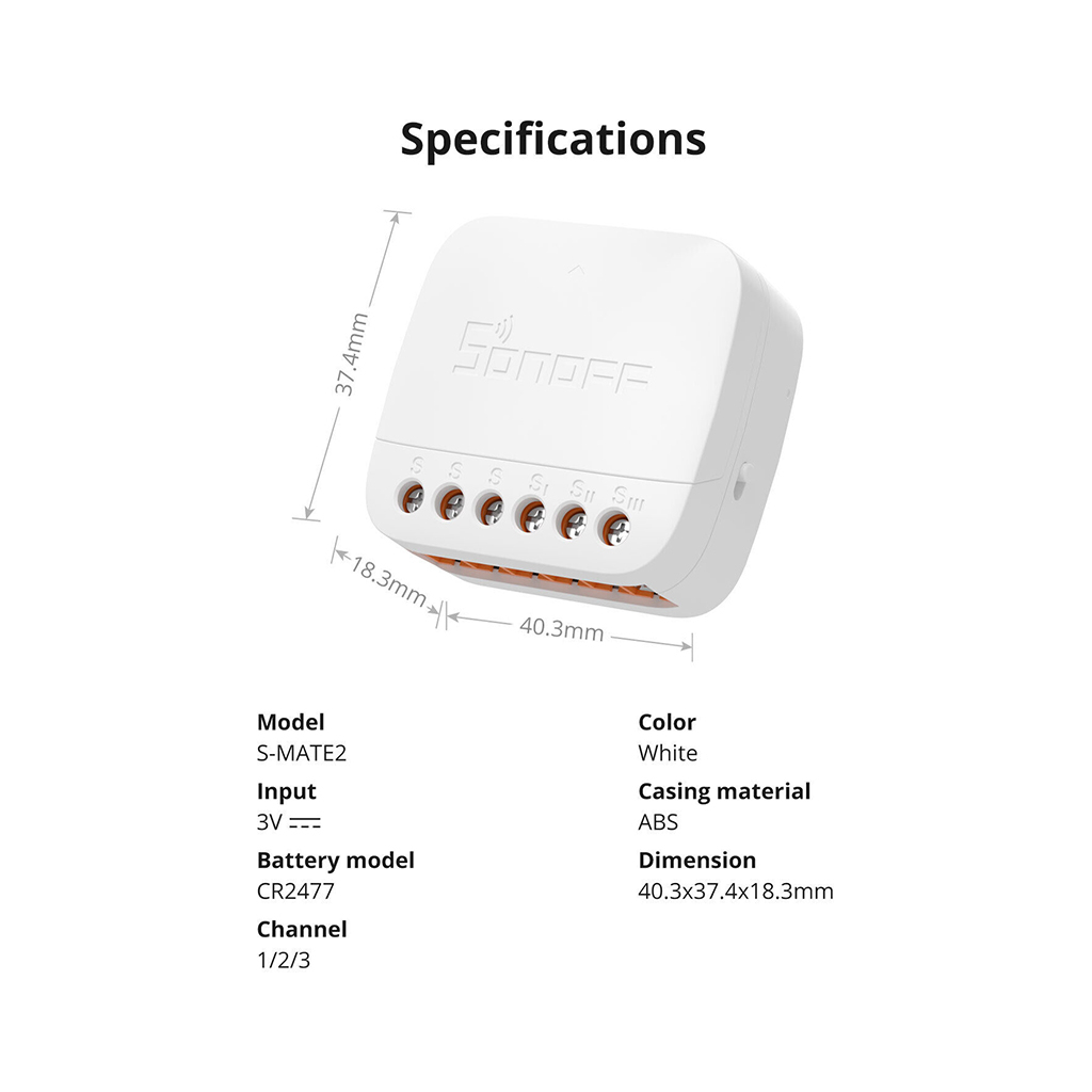 Sonoff S-Mate2 - реле для підключення звичайного одно-, дво- або триклавішного вимикача та водночас пульт дистанційного керування. Реле працює від батарейки, тому не вимагає нульової лінії в монтажній коробці.Особливістю S-Mate2 є те, що реле є "підпристроєм eWeLink Remote", тож може локально керувати іншими пристроями після підключення до віддаленого шлюзу eWeLink Remote (MINIR4, DUALR3/DUALR3 Lite, M5 або NSPanel Pro) за умови підключення до мережі та встановлення локальної сцени.