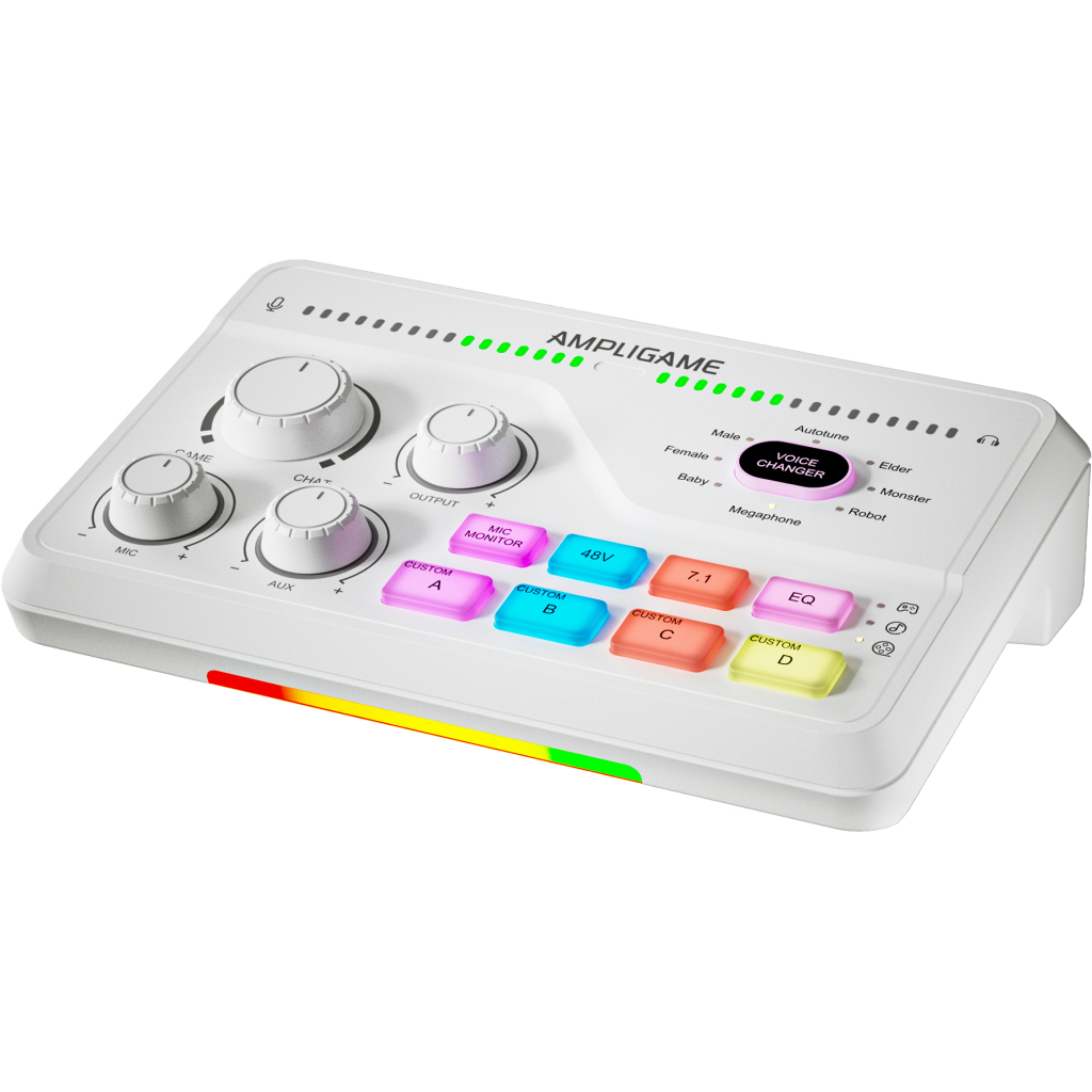 Он позволяет регулировать баланс между игрой, голосом и микрофоном в реальном времени, добавляя эффекты и изменение голоса одним нажатием. Модель отличается 15 режимами RGB-подсветки, среди которых — статический одноцветный, динамический многоцветный градиент и пульсирующий градиент. Яркая подсветка не только создает атмосферу, но и делает микшер стильным элементом вашей геймерской студии.