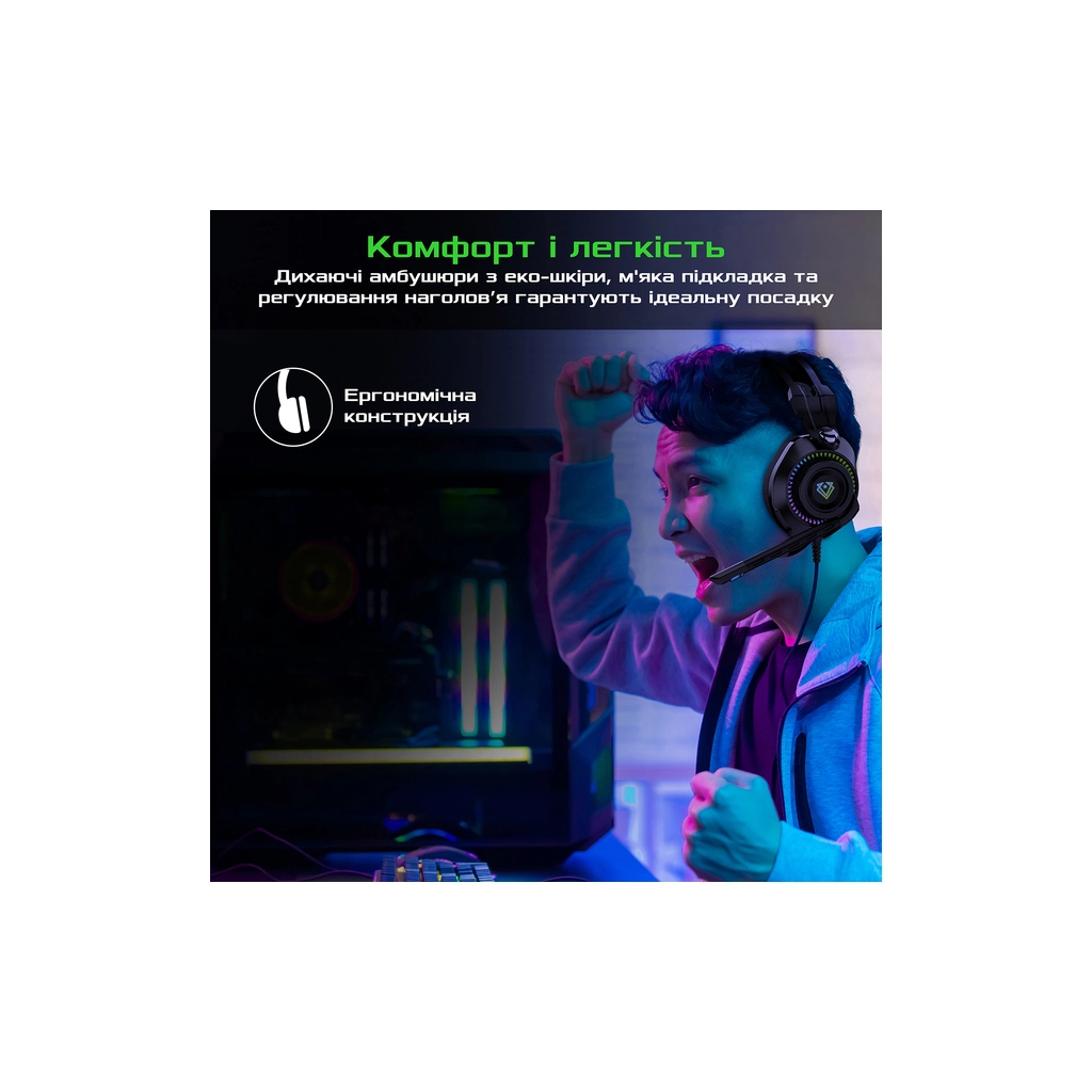- Комфорт и легкость: Дышащие амбушюры из эко-кожи, мягкая подкладка на дужке, регулировки оголовья и микрофона гарантируют идеальную посадку для любого геймера.