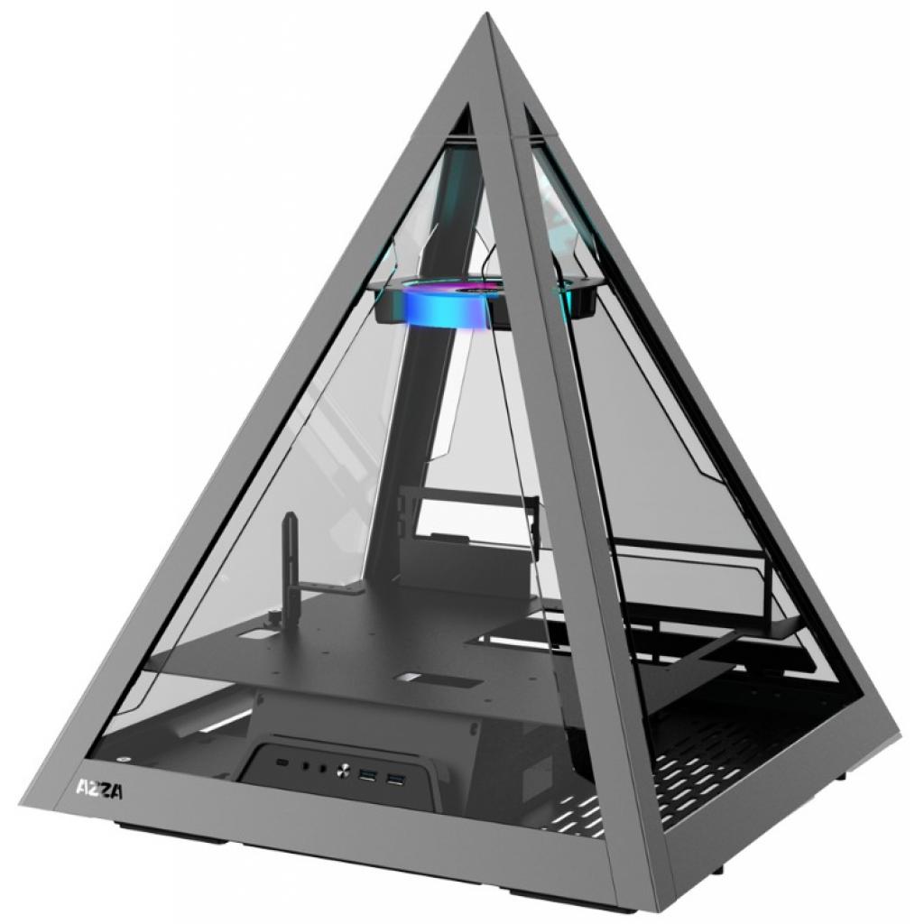 Внешняя конструкция, состоящая из металлического каркаса и закалённого стекла, устанавливается на бенчтейбл после монтажа компонентов. Вверху расположен 120-мм RGB-вентилятор, охлаждающий железо сверху. Ещё три 120-мм вентилятора можно установить на дне. Возможно также использование 360-мм радиатора. Сбоку имеется панель ввода-вывода с двумя портами USB 3.0, разъёмом USB Typ-C и аудио разъёмами. Форма пирамиды ограничивает высоту кулера 8 см. Длина видеокарты не должна превышать 30 cм. Azza использует в корпусе закалённое стекло и сталь SPCC толщиной 1.5 — 2 мм, а также алюминий толщиной 2.5 мм. Габариты корпуса составляют 490 x 558 x 490 (Ш x В x Г), вес — 14 кг.