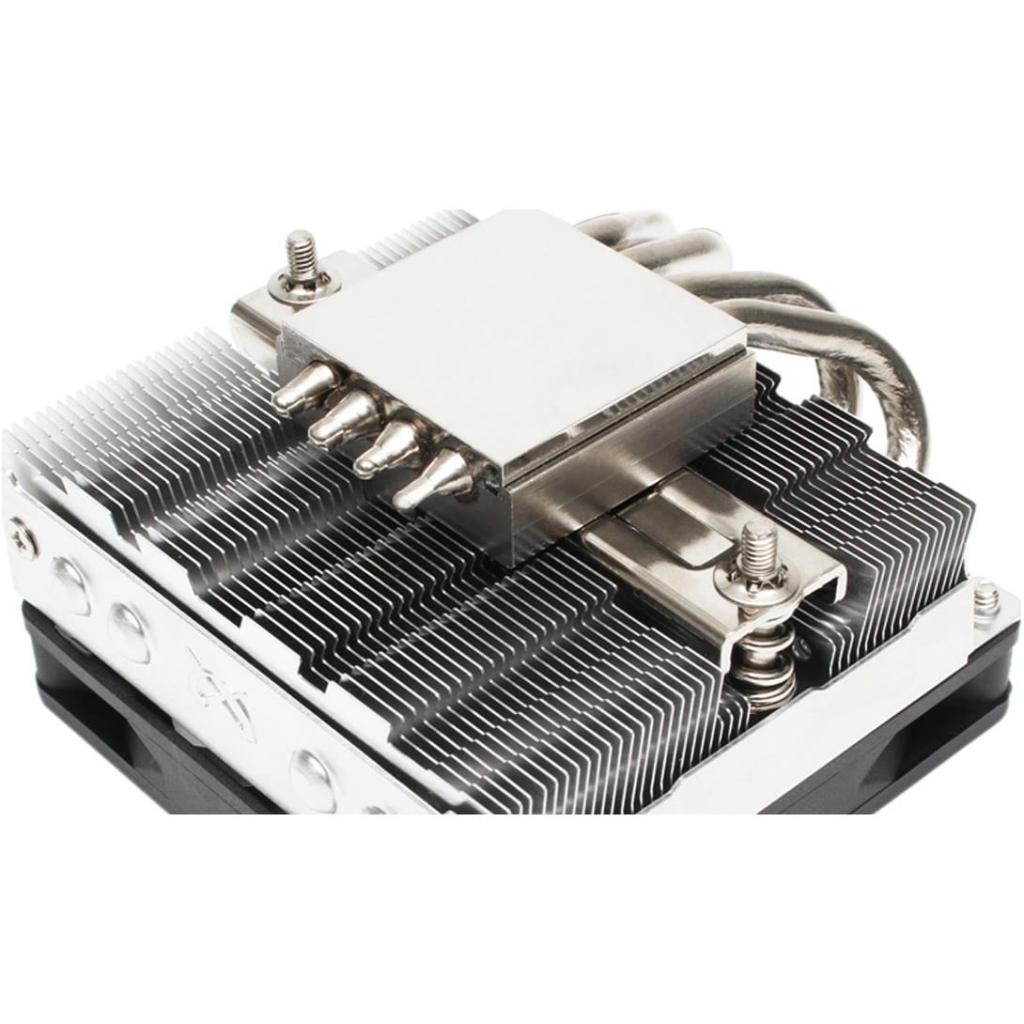 Конструкция системы охлаждения включает алюминиевый радиатор, ребра которого перпендикулярны плоскости системной платы. Четырьмя тепловыми трубками диаметром 6 мм радиатор связан с никелированным медным основанием, контактирующим с крышкой процессора.