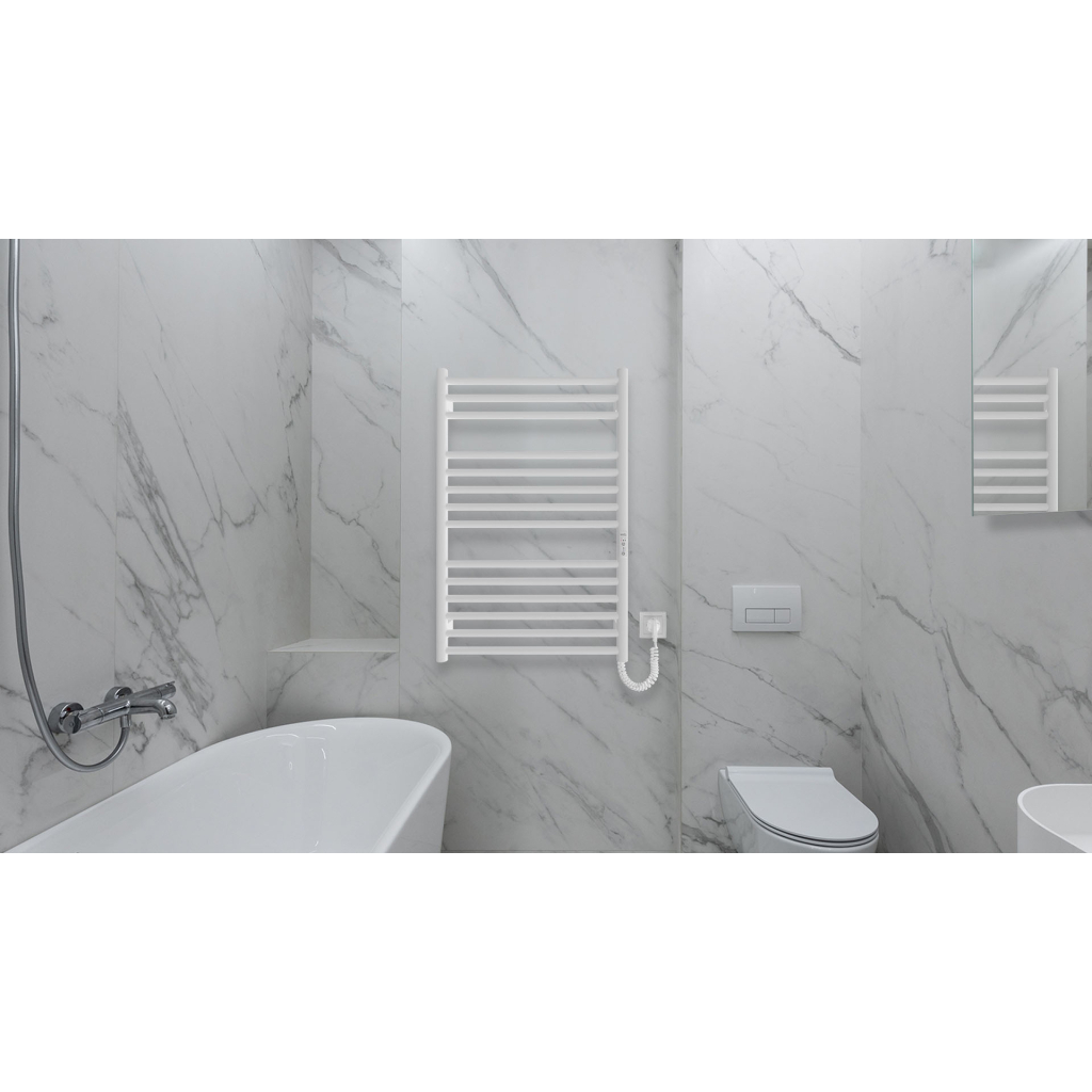 Электрический полотенцесушитель HF Greenwich 770×530 Оборудован таймером-регулятором и имеет скрытое подключение. Он состоит из 14 ребер и стоек из круглой трубы. Доступные варианты отделки: Матовый черный и Матовый белый. Температурные режимы таймера-регулятора включают 40°C, 45°C и 50°C. Вы можете выбрать время работы: 3 часа, 6 часов или постоянное нагревание.