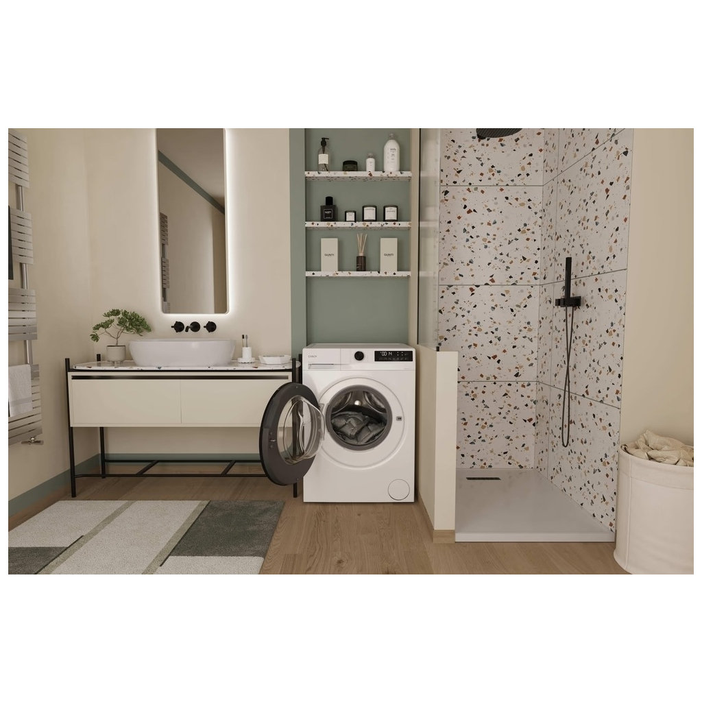 Стиральная машина Candy GD48B9-S имеет тщательно продуманный дизайн с белоснежным корпусом и черными дверцами, которые добавляют элемент элегантности. Она идеально впишется в интерьер любой ванной комнаты или прачечной.