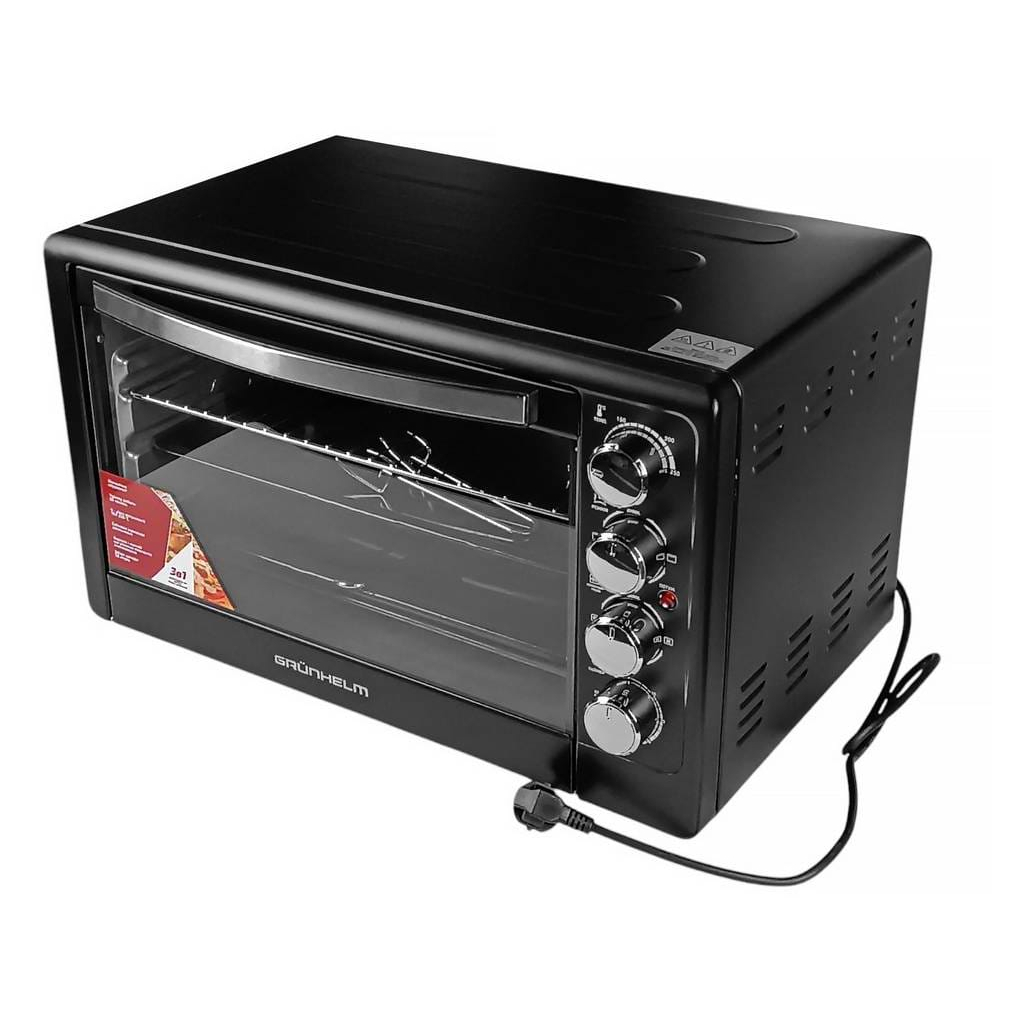 Электрическая печь Grunhelm GN50ARC имеет весьма объемную камеру, которая способна вместить в себя большие блюда – 50 л. Общий дизайн эргономично продуман и остается классическим, поэтому внедрить такую печь на кухню будет несложно. Габариты корпуса равны 41x58.3x37 см. Оформление в черном цвете с хромированными элементами – базовый вариант, который приветствуется в любой кухне. Механические регуляторы управления представлены четырьмя поворотными переключателями, которые имеют понятный интерфейс.
