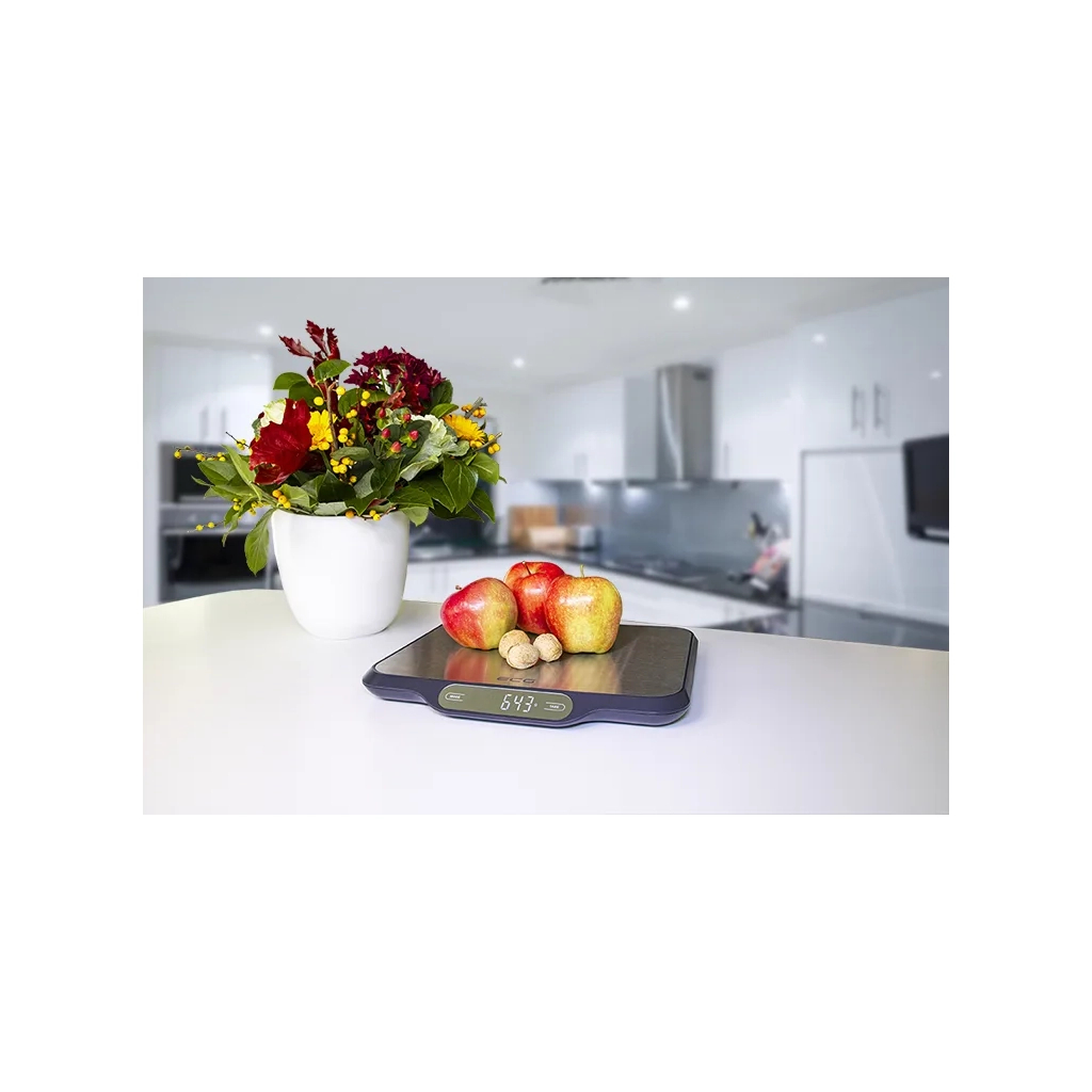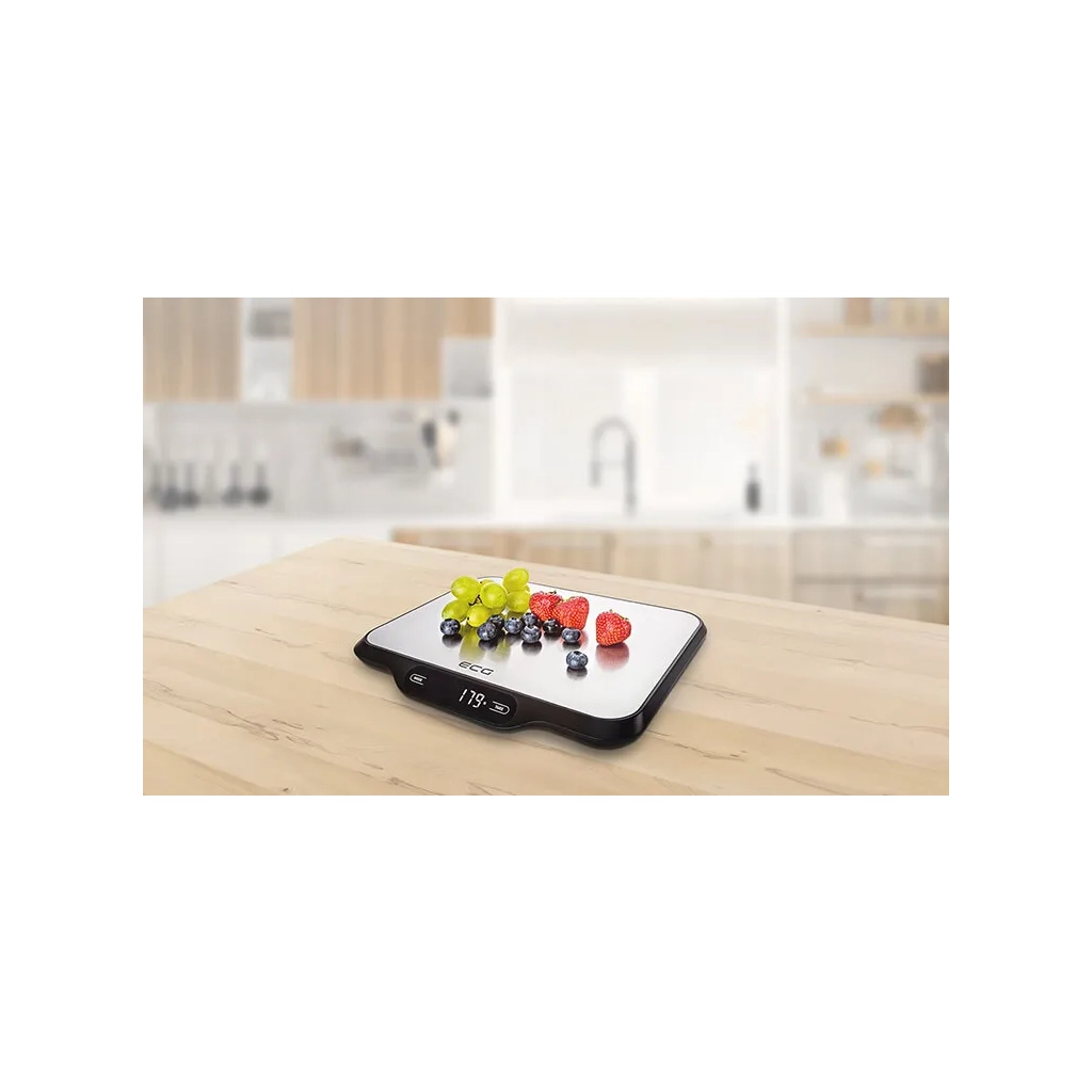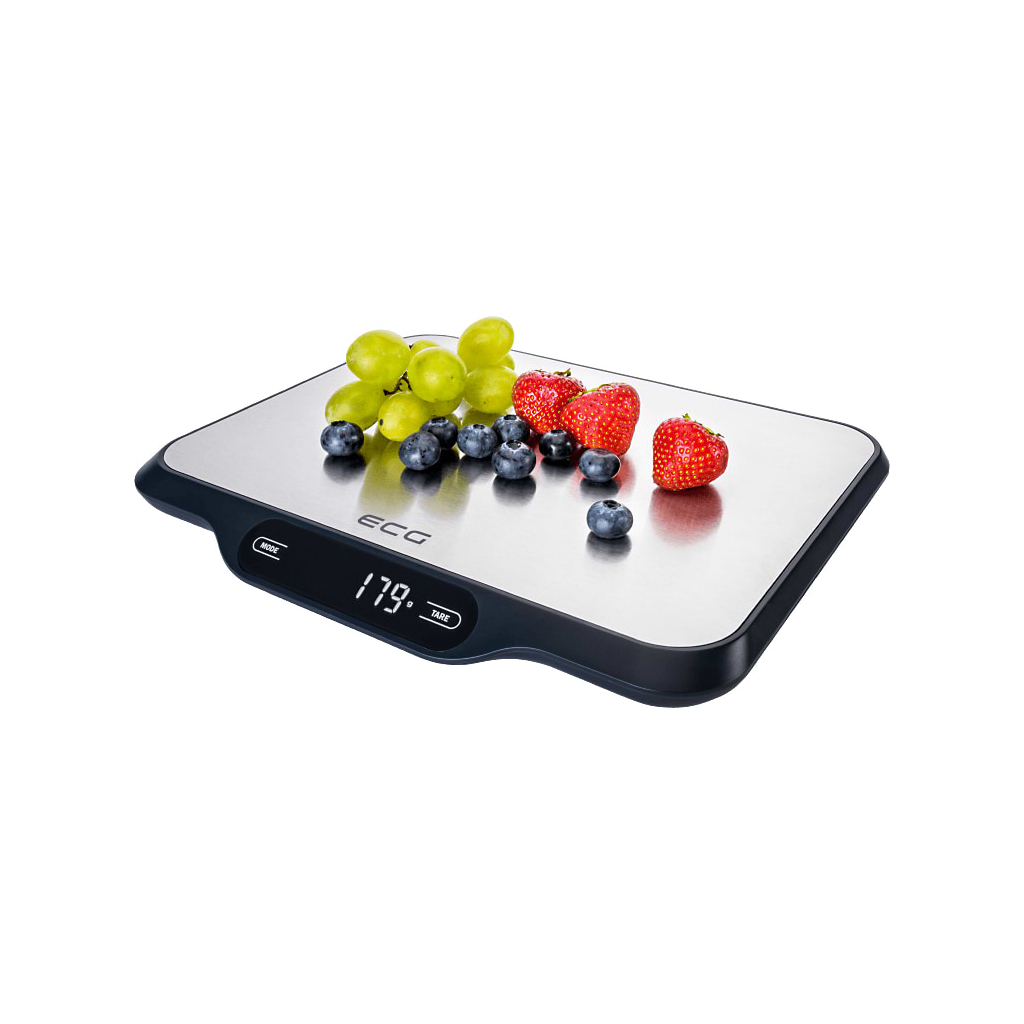 Весы кухонные ECG KV 215 S с максимальной нагрузкой в 15 кг и шагом измерения 1 грамм, оснащены плоской платформой из нержавеющей стали.