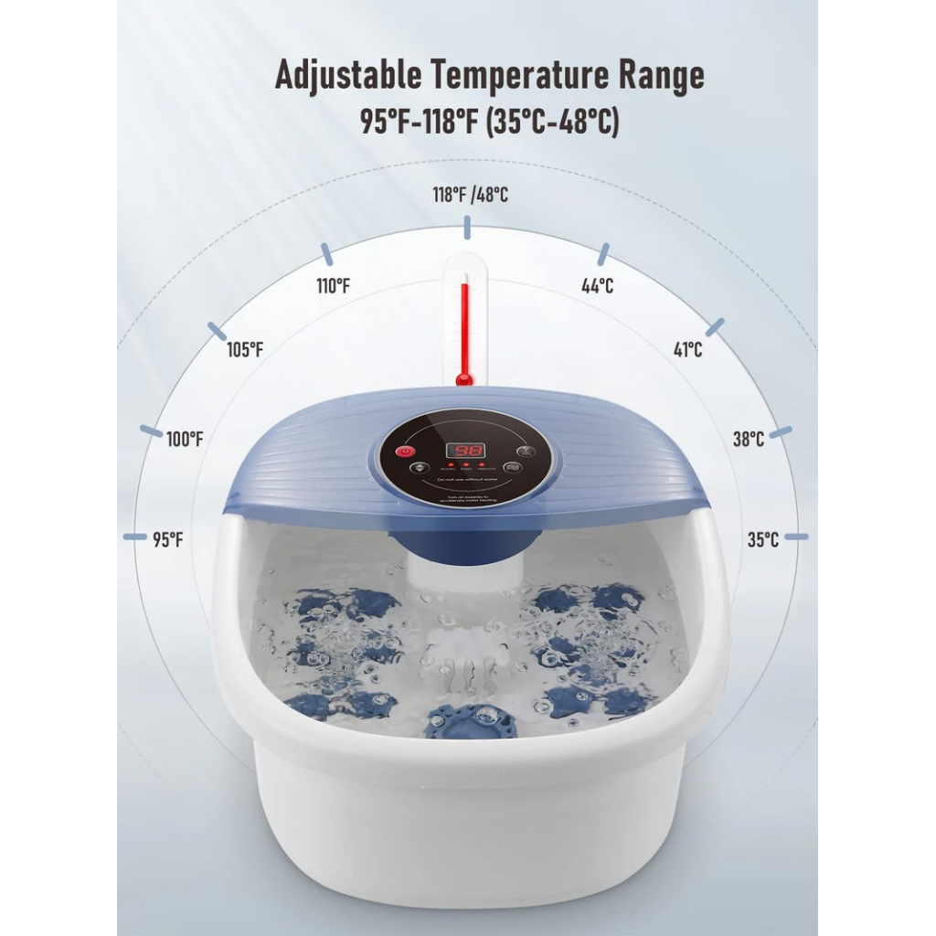 Adjustable heating from 35°C to 48°C (95°F – 118°F) ensures the perfect warm soak, easing tension, reducing stress, and delivering professional-level foot care at home.