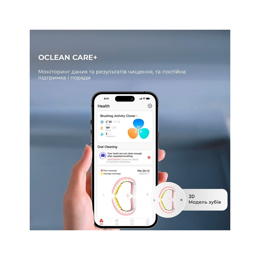 Оптимальная сила нажатия, угол 45 градусов к линии десен и тщательная проработка каждой зоны? Не волнуйтесь, с Oclean X Ultra Set ваш стиль чистки – под профессиональным контролем. Ведь каждое ваше движение анализирует 6-осевой гироскоп, самый точный в мире линейный датчик давления и алгоритмы ИИ. Если вы нажмете слишком сильно, прозрачное основание загорится красным цветом. А если пропустите определенную зону – щетка выдаст звуковой сигнал и оповещение на экране. В приложении вы можете просмотреть, какому участку нужно больше внимания. Кроме того, приложение позволяет настроить таймер, план очистки и любые параметры, такие как сила и время. Фирменное приложение Oclean Care+, Apple Health или Apple Homekit – выбор за вами.