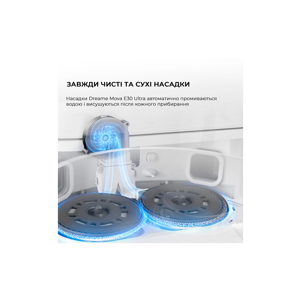 Благодаря автоматической промывке и сушке насадок, Dreame Mova E30 Ultra поддерживает безупречную чистоту: насадки тщательно промываются водой и высушиваются после каждой уборки, исключая появление плесени и неприятных запахов.
