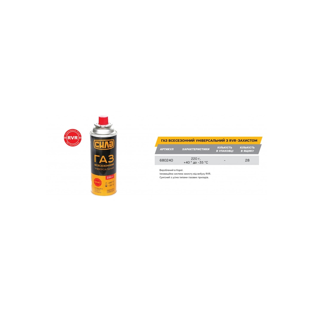 Газовый баллон СИЛА 220 г с цанговым механизмом — это высококачественный продукт, произведенный в Корее, который идеально подходит для рыбаков, охотников и туристов. Уникальная система защиты от взрыва RVR делает его использование более безопасным. Баллон содержит высококачественную смесь пропана и бутана, которая обеспечивает высокое давление паров и эффективное горение даже при температуре от -35°C до +40°C.