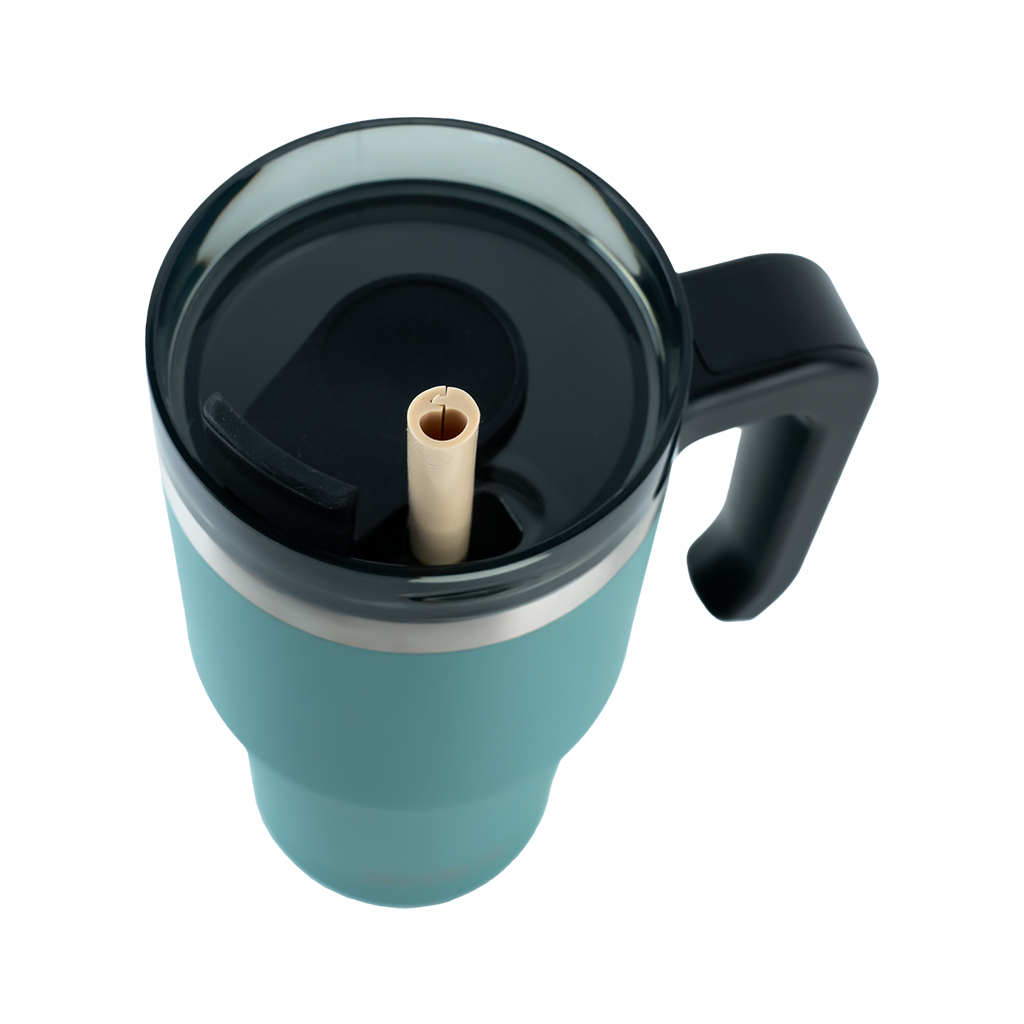 Эта модель обладает уникальной особенностью – имеет в комплекте разборную силиконовую трубочку, которую удобно мыть и просушивать после использования. Из кружки можно пить как через отверстие, так и через трубочку. Стильная прозрачная крышка надежно закрывается.