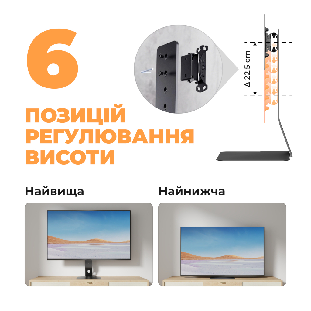 Завдяки можливостям повороту, нахилу та регулювання висоти, підставка забезпечує оптимальний кут огляду з будь-якого місця в кімнаті. Міцна металева основа гарантує стабільність і надійність, а вбудований отвір для кабелів допомагає підтримувати охайний вигляд робочого простору.