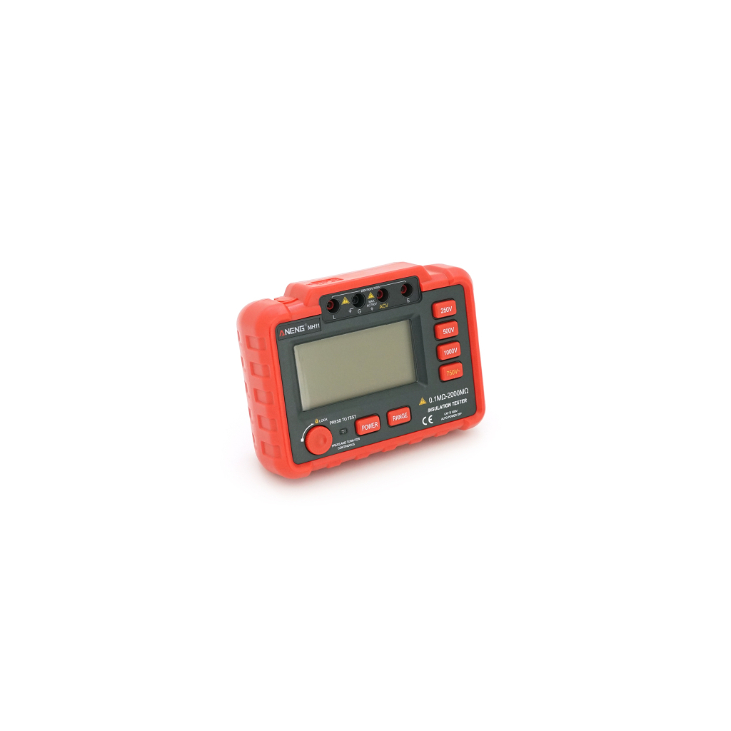 Особливості та переваги тестера ізоляції ANENG MH11 Цифровий пристрій вимірювання опору ізоляції. Пристрій використовує перетворювач постійної напруги з низькими втратами і високим коефіцієнтом індуктивності, який здатний перетворювати напругу 12 на напругу DC 250 В/500 В/1000 В. Пристрій використовує цифровий LCR міст для вимірювання опору ізоляції. Ергономічний дизайн, міцний корпус, невеликі габарити та вага пристрою забезпечують зручну перевірку опору заземлення у різних лабораторних та польових умовах. Захисне покриття та антиковзні бічні канавки із силіконового матеріалу захищають пристрій від падіння та пошкоджень. Широкий діапазон вимірів. Стабільна точність вимірів. Великий РК-дисплей високої чіткості з підсвічуванням, що забезпечує зручне зчитування результатів вимірювання навіть у місцях із поганим освітленням. Функція автоматичного вимкнення живлення для економії заряду батарей. Наявність ременів для роботи обома руками з пристроєм.