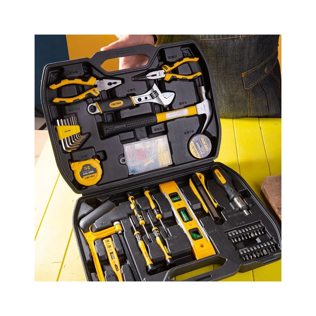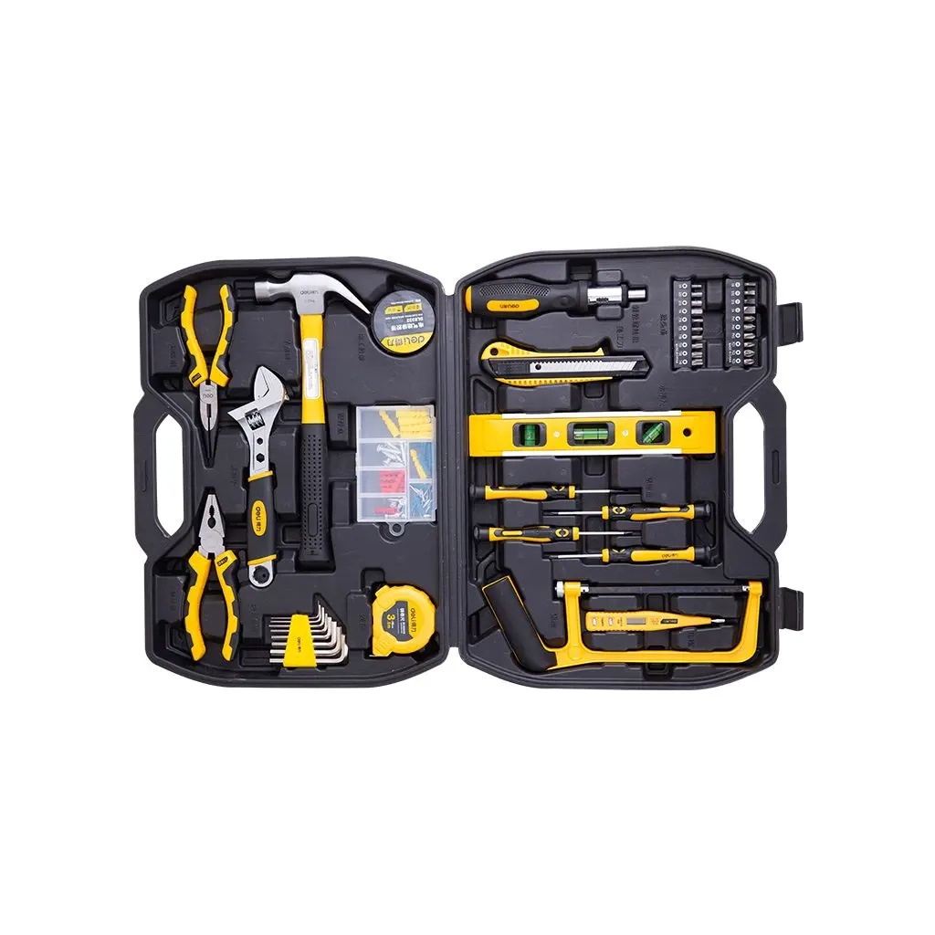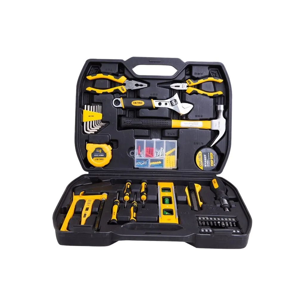 | Комплектація набору | шарнірно-губцевий інструмент, викрутки, біти, шестигранні/зіркоподібні ключі, молоток, пасатижі, розвідний ключ, рівень, рулетка, ніж, ножівка, довгогубці, ізострічка |
