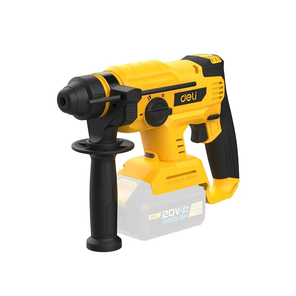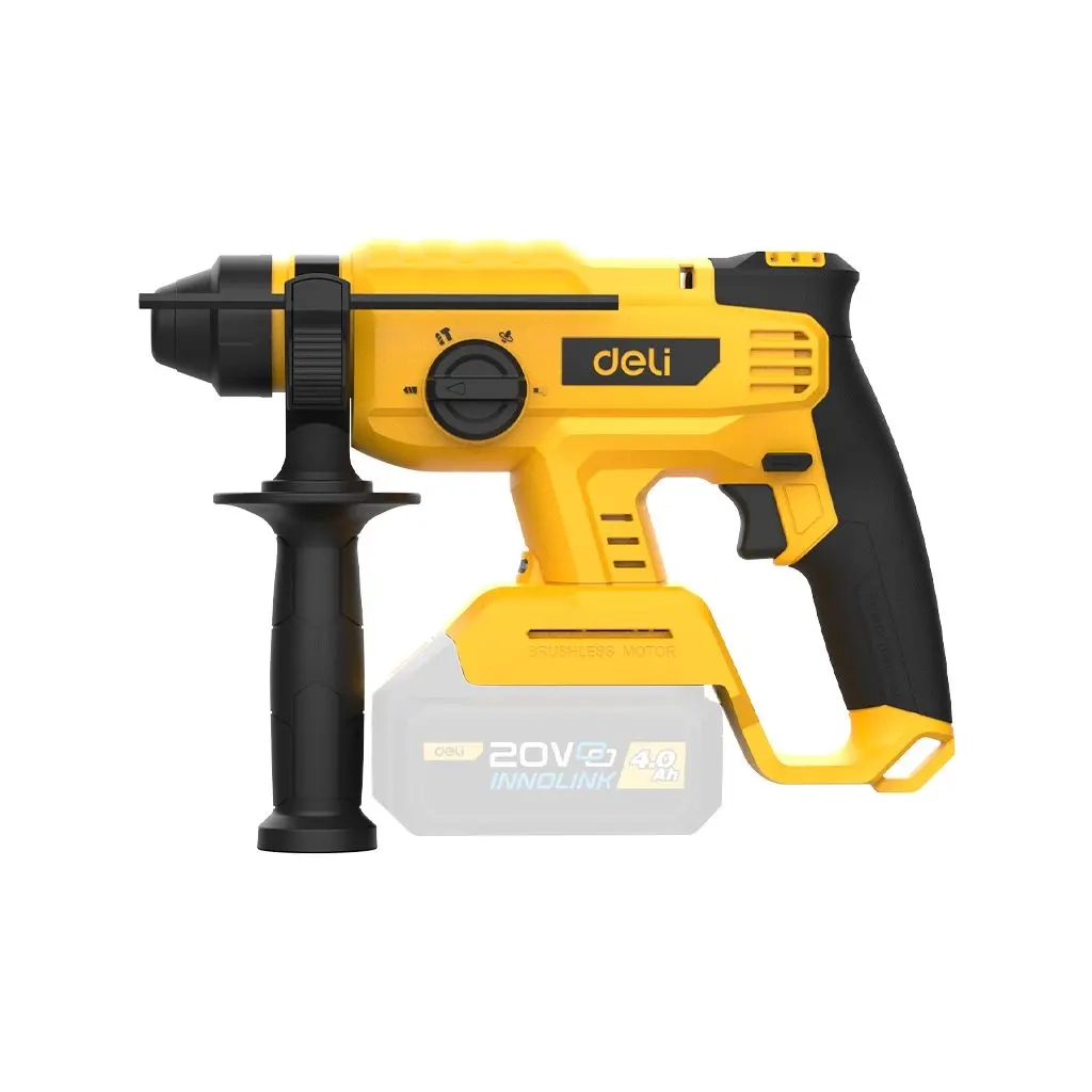 Акумуляторний перфоратор Deli EDC300Z — безщіткова потужність 20 В. До 1400 об/хв, 4500 уд/хв і енергія удару 2 Дж. Свердління: бетон — 22 мм, сталь — 13 мм, дерево — 28 мм. Акумулятор не входить до комплекту. Упаковано в кольорову коробку — ідеально для складних робіт.