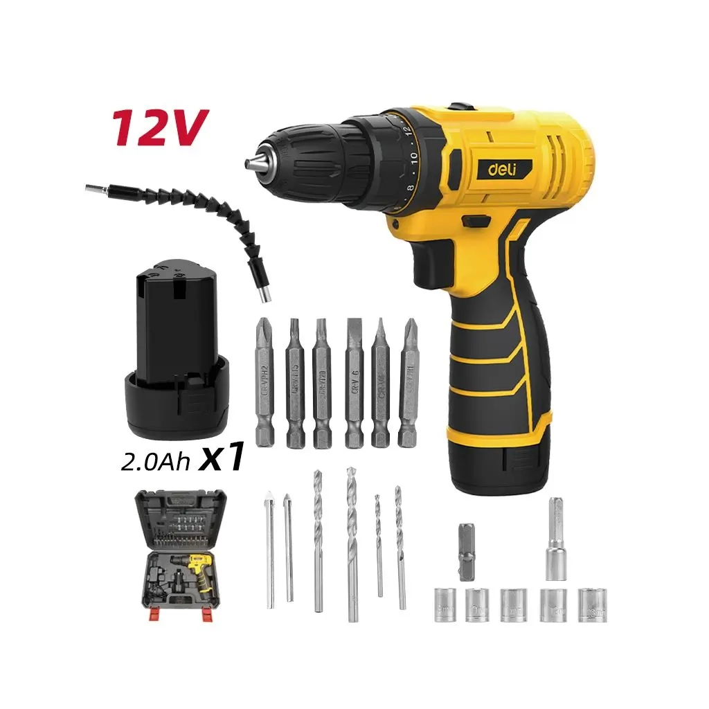 Акумуляторний набір DeliTols EDL-DZ12-6A2 — компактна потужність на 12 В. У комплекті: дриль із двома швидкостями (0 – 400 / 0 – 1500 об/хв), крутний момент 30 Нм, 18+1 режим, патрон 10 мм, акумулятор 2,0 Ah. Аксесуари: свердла по дереву (3 – 6 мм), по склу (5 – 6 мм), головки (5 – 13 мм) і гнучкий вал. Упаковано в пластикову коробку з кольоровим рукавом — готовий до роботи з деревом, металом і точними задачами.