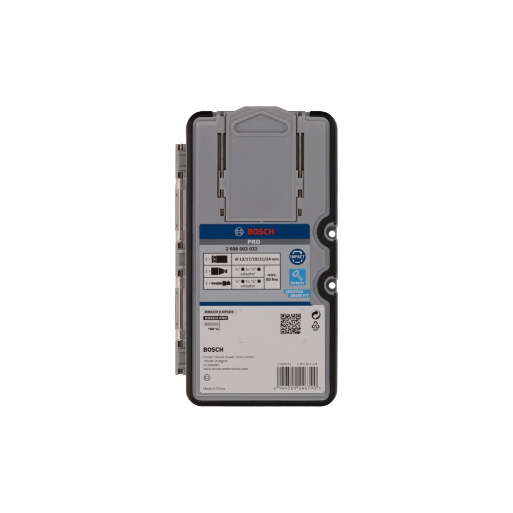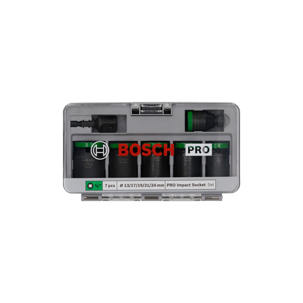 Набір ударних торцевих головок Bosch Pro Impact Socket Standard Set 1/2" 13-24 мм призначений для роботи з кріпленням середнього розміру з використанням ударних гайкокрутів і шуруповертів. Варіанти посадки 1/2 дюйма і перехідники дають змогу використовувати комплект із різним інструментом - як із квадратним, так і з шестигранним хвостовиком.                            Характеристики