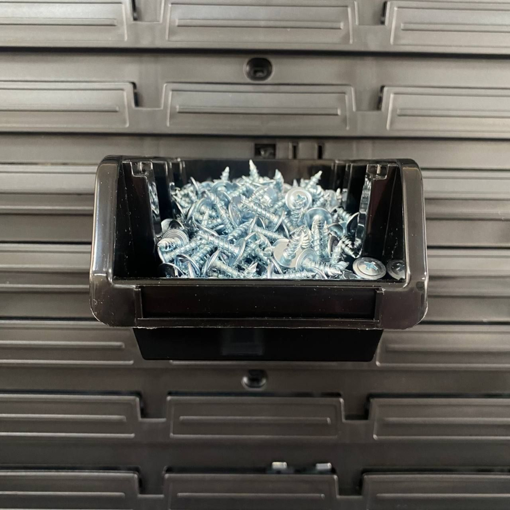 Ємність для зберігання має корпус, виготовлений із міцної полімерної суміші, чорного кольору.