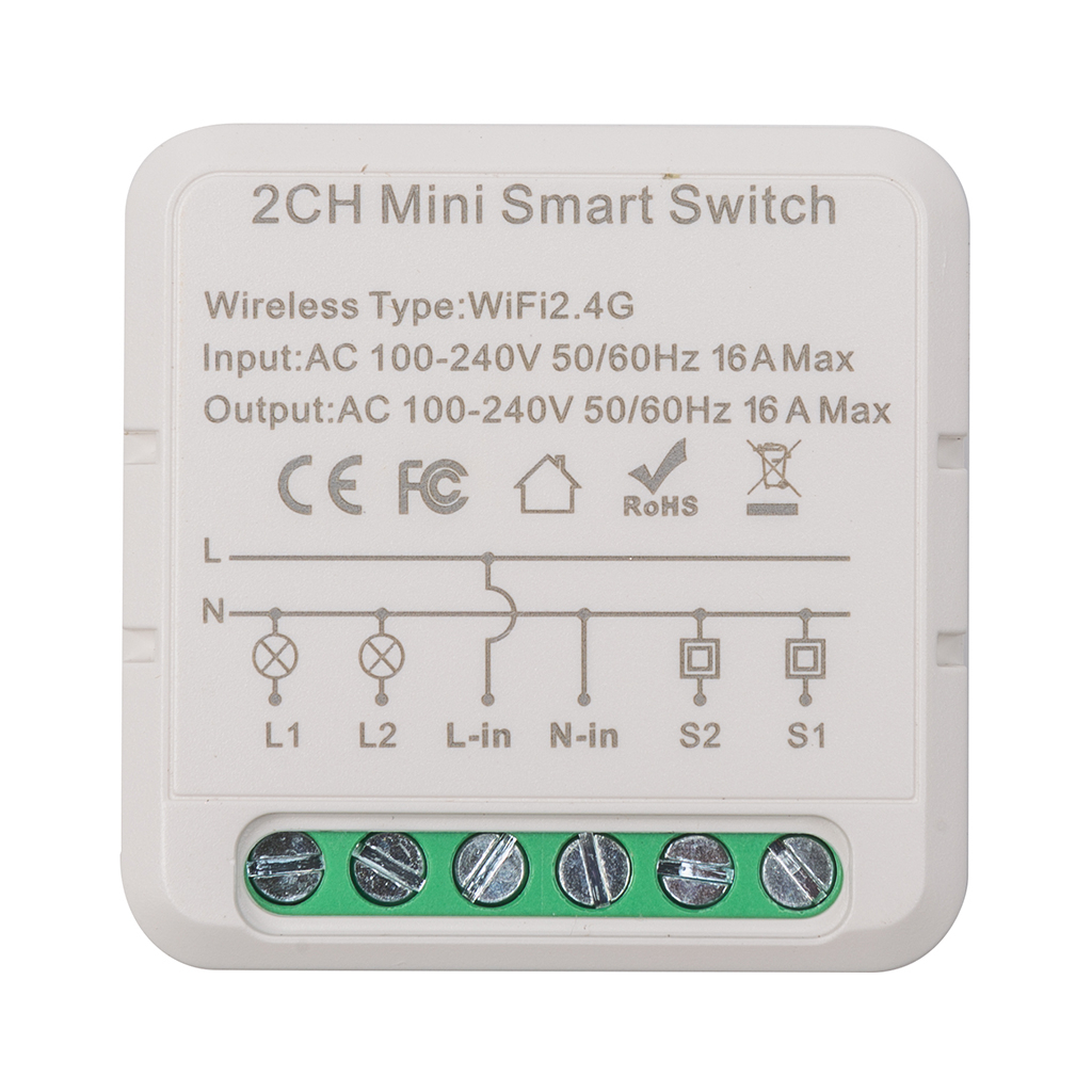 Розумний 2-канальний міні-вимикач для електричних пристроїв своїми руками, який підтримує дистанційне керування через Wi-Fi за допомогою додатків Tuya Smart та Smart Life. Без функції вимірювання.Особливості: