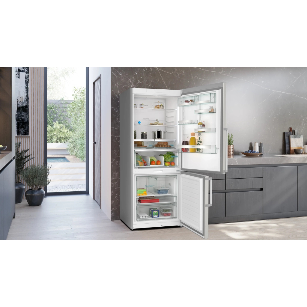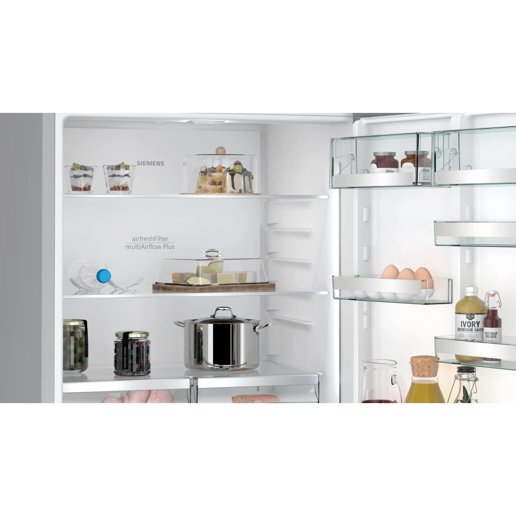 Холодильна камера обладнана трьома міцними полицями з загартованого скла, шістьма місткими дверними корзинами та практичним контейнером для овочів. Естетично виготовлені елементи дозволяють ефективно організувати простір і забезпечують легкий доступ до всіх продуктів. Особлива увага приділена зонам hyperFresh, котрі мають окремі ящики для м'яса та риби, де підтримується оптимальна температура для збереження свіжості.