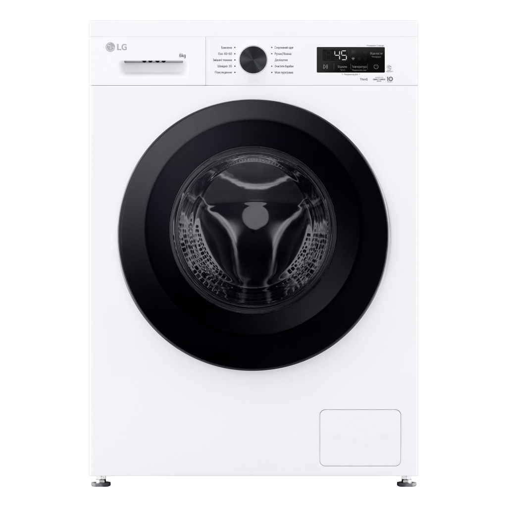 | Особливості | Блокування від дітей, Технологія 6 MOTION, індикатор залишкового часу, Автоматичний перезапуск із збереженням попередніх налаштувань, Блокування панелі керування від дітей, Система зменшення рівня вібрації, Система контролю піноутворення, Технологія контролю напруги (174-400 В), індикація помилок у роботі, затримка завершення циклу прання (3-19 годин), індикація незачинених дверцят, Функція обробки парою Steam, 'Система зменшення рівня вібрації, Індикація завершення роботи, Відкриття дверей: праворуч, індикація етапу циклу прання, індикація обраних параметрів програми, індикація режиму "Відкласти завершення", індикація режму "Віддалений старт", Завантаження додаткових програм через додаток LG ThinQ™ по Wi-Fi, Віддалене керування через додаток LG ThinQ по Wi-Fi |