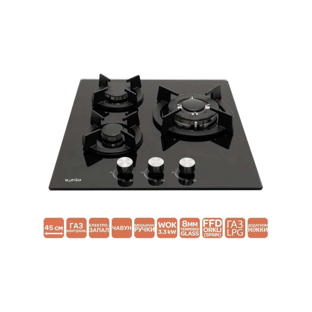Для приготування їжі доступні 3 газові конфорки різної потужності - від 1 до 3.3 кВт. З їх допомогою ви зможете, як швидко розігріти їжу вранці, так і готувати одночасно 3 страви. Найбільша конфорка має 3 ряди полум’я та ідеально підходить для швидкого розігріву. Варто також відзначити, що у кожної конфорки є своє кругла чавунна решітка у формі корони. За рахунок цього поверхню легко мити, а також вона має незвичний дизайн.