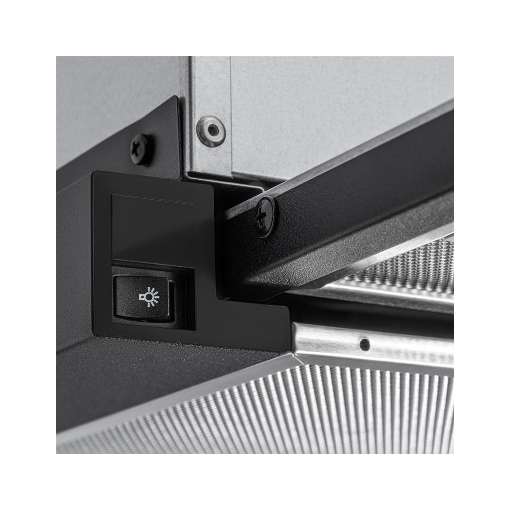 Непомітний помічник на кухні сподобається любителям мінімалізму. Витяжка повністю вбудовується у шафу та ідеально підходить для невеликих кухонь. Продуктивність 400 м3/год - цього достатньо для кухні 8-9 м2. LED освітлення забезпечує комфортне приготування страв навіть у темну пору доби. Ергономічне механічне керування дозволяє легко змінювати швидкості. Витяжка може працювати у двох режимах на вибір - відведення повітря або рециркуляція.