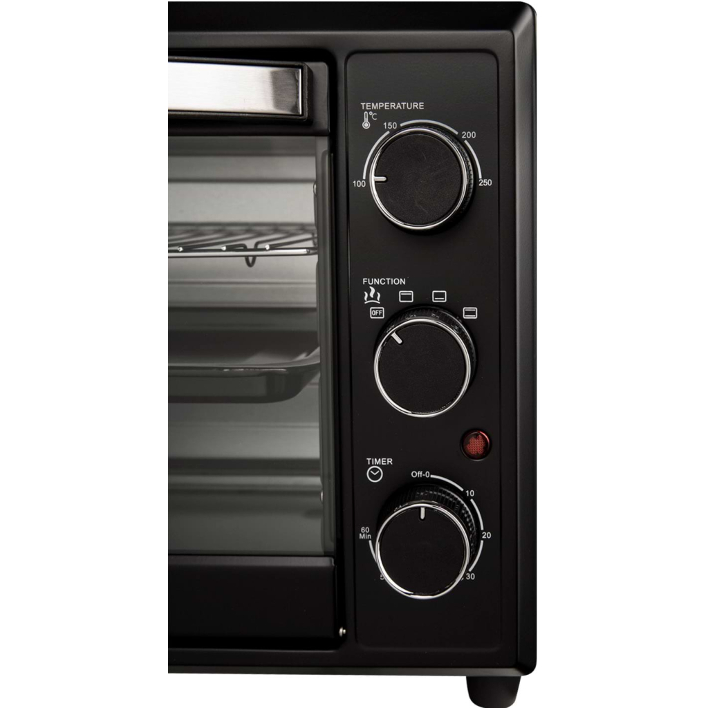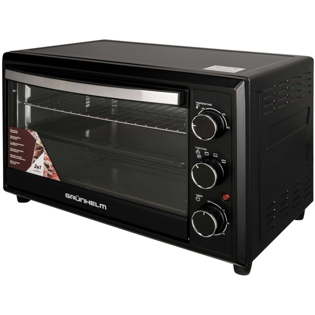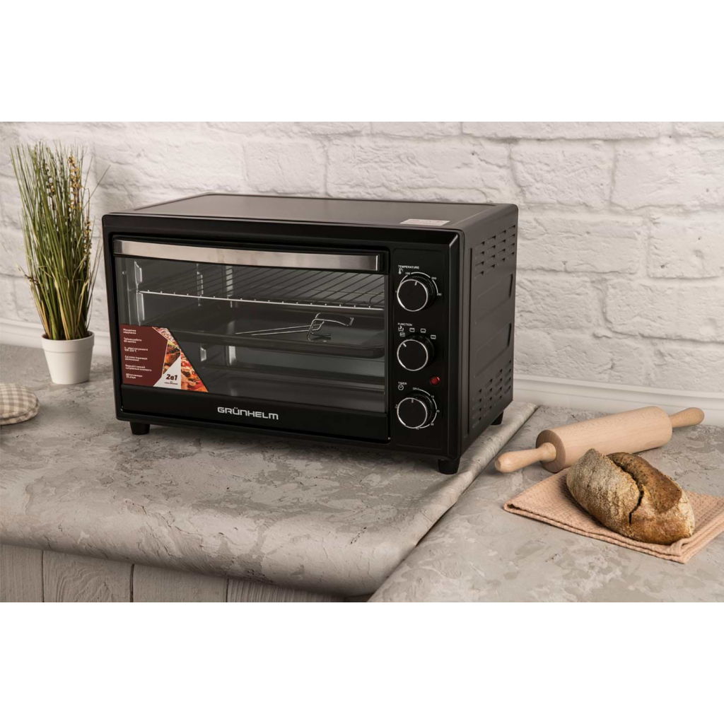 ОснащенняЗавдяки режиму конвекції Grunhelm GN33AВ готує будь-яку страву значно швидше, оскільки нагрів відбувається не тільки знизу, але і з усіх боків. Режим гриль порадує любителів засмаженої золотистої скоринки, адже включивши його будь-яку страву ідеально підрум'янитися. Ну, а механічний режим управління за допомогою поворотних регуляторів максимально полегшує роботу апарату. Світловий індикатор візуально сигналізує користувачу про роботу печі, таймер подає звуковий сигнал про закінчення приготування, терморегулятор контролює температуру.