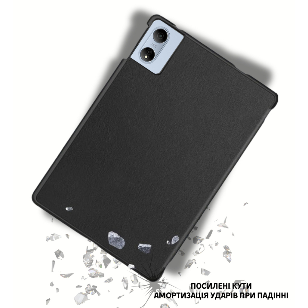 Основою чохла є міцний пластиковий каркас, що щільно фіксує планшет і захищає корпус від ударів та подряпин. Зовнішня частина виконана з високоякісного матеріалу з текстурою під шкіру — приємного на дотик, практичного та стійкого до зношування. Внутрішня обкладинка оздоблена м’якою мікрофіброю, яка захищає дисплей від потертостей та випадкових слідів.