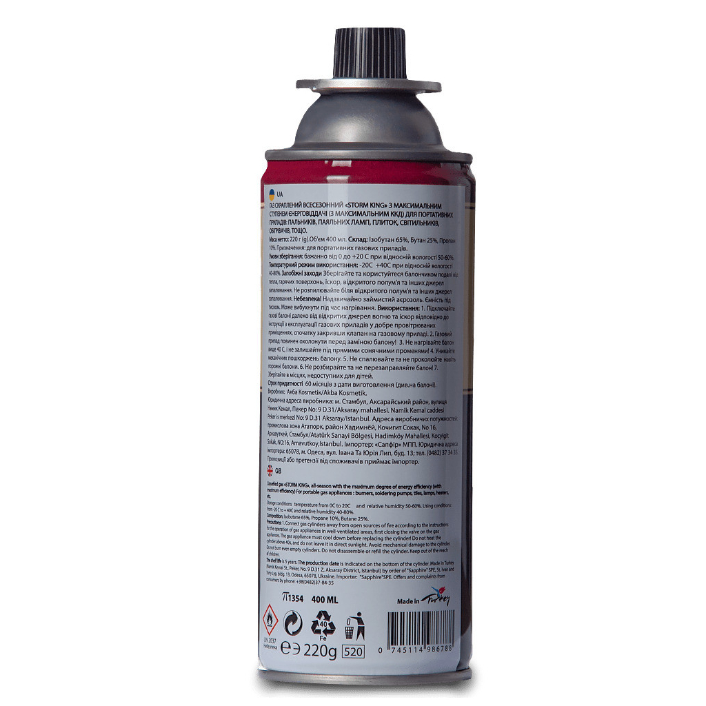 У балон вбудований клапан CRV. Клапан СRV-клапан безпеки. При піднятті тиску в балоні він дуже повільно стравить надлишок тиску до норми. Оскільки газ справді має високий ступінь очищення (треба зауважити, що в Україні навіть немає аналогів такої високої якості) газове обладнання працюватиме довго та справно. Жодної кіптяви та нагару. Ідеально підходить для всіх газових приладів-переносних плит, паяльників, світильників, обігрівачів, ламп... Склад: Ізубутий - 65%. Бутан – 25%. Пропан – 10%.