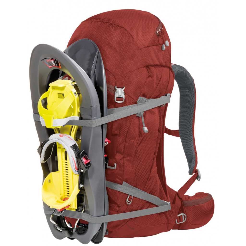 - Trekking poles holders (2) - тримачі для трекінгових палиць розміщуються у верхній і нижній частині фасаду Трекінгові рюкзака і, як правило, являють собою комбінацію нижніх петель і верхніх стяжних еластичних шнурів з фіксатором. Рідше нижні петлі замінюються такими ж стяжними шнурами. Такі власники дозволяють надійно фіксувати трекінгові палки і не завантажувати ними внутрішній простір рюкзака. Даний рюкзак має дві пари кріплень для трекінгових палиць, поєднаних з кріпленнями для льодорубів.