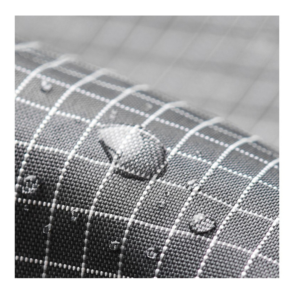 У пошитті використано синтетичну тканину, отриману з перероблених пластикових відходів. З внутрішньої сторони є підкладка з поліаміду. Сітчаста вставка в зоні спинки покращує циркуляцію повітря, щоб шкіра не випрівала під час тривалого носіння рюкзака.