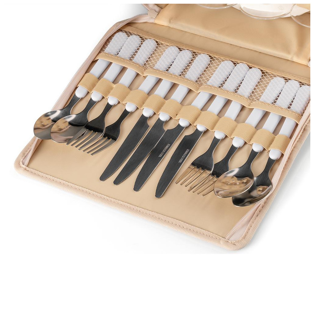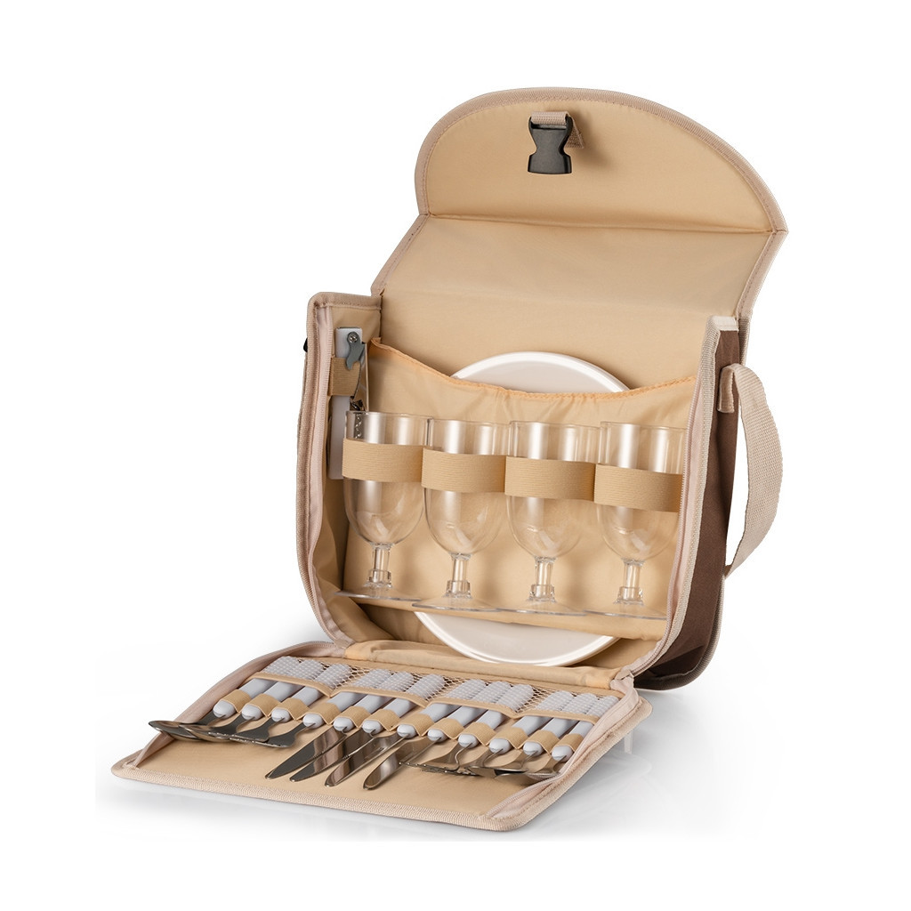 У наборі є все необхідне для смачного пікніка: тарілки, штопор, стильні келихи, з яких приємно смакувати вино і говорити одне одному найзаповітніші слова.