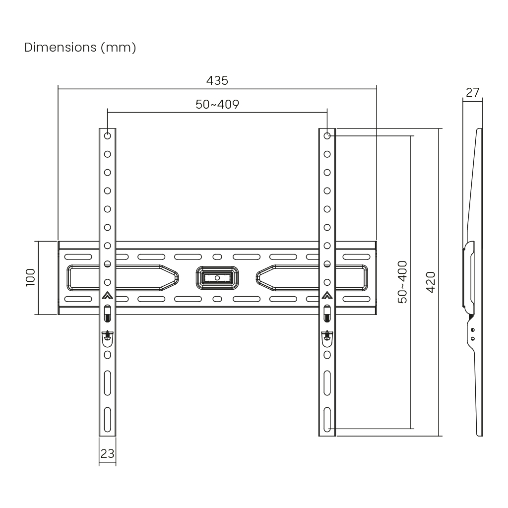| VESA | 50 x 50, 75 x 75, 100 x 100, 150 x 100, 200 x 100, 200 x 200, 200 x 300, 300 x 200, 200 x 400, 300 x 300, 400 x 200, 400 x 300, 400 x 400, 100 x 200, 100 x 150, 300 x 400 |