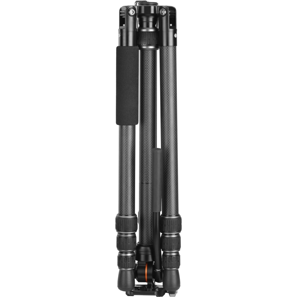 Ніжки штатива складаються з чотирьох секцій із міцного та легкого карбону, максимальний діаметр яких становить 26 мм — це забезпечує надійну підтримку навіть для важкої апаратури. Зручна система фіксації Flip Lock (кліпса) дозволяє швидко розкладати або складати трипод, не відволікаючись від процесу знімання. Кожна ніжка має три фіксовані кути нахилу — 20°, 50° та 80°, це дозволяє стабільно встановлювати штатив навіть на нерівній поверхні або знімати з низьких ракурсів. Центральна колона обладнана вбудованим адаптером для низьких кутів, даючи змогу опускати камеру практично до землі. Для покращення стійкості під час знімання на відкритому повітрі передбачено пружинний гачок для підвішування додаткового вантажу, а бульбашковий рівень допомагає точно вирівняти горизонт.